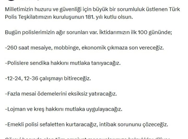 CHP Genel Başkanı Özgür Özel, Türk Polis Teşkilatı’nın 181. kuruluş yıl dönümünü sosyal medya hesabı üzerinden kutladı....